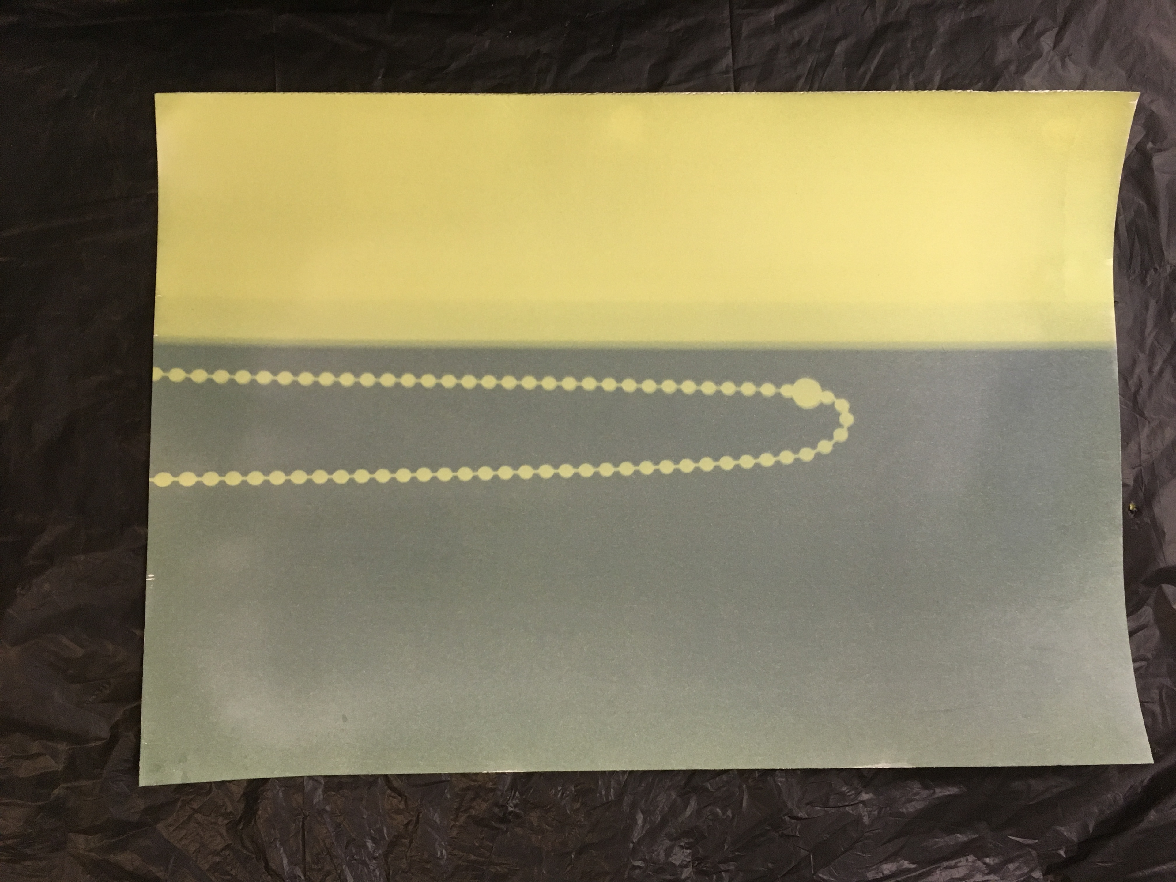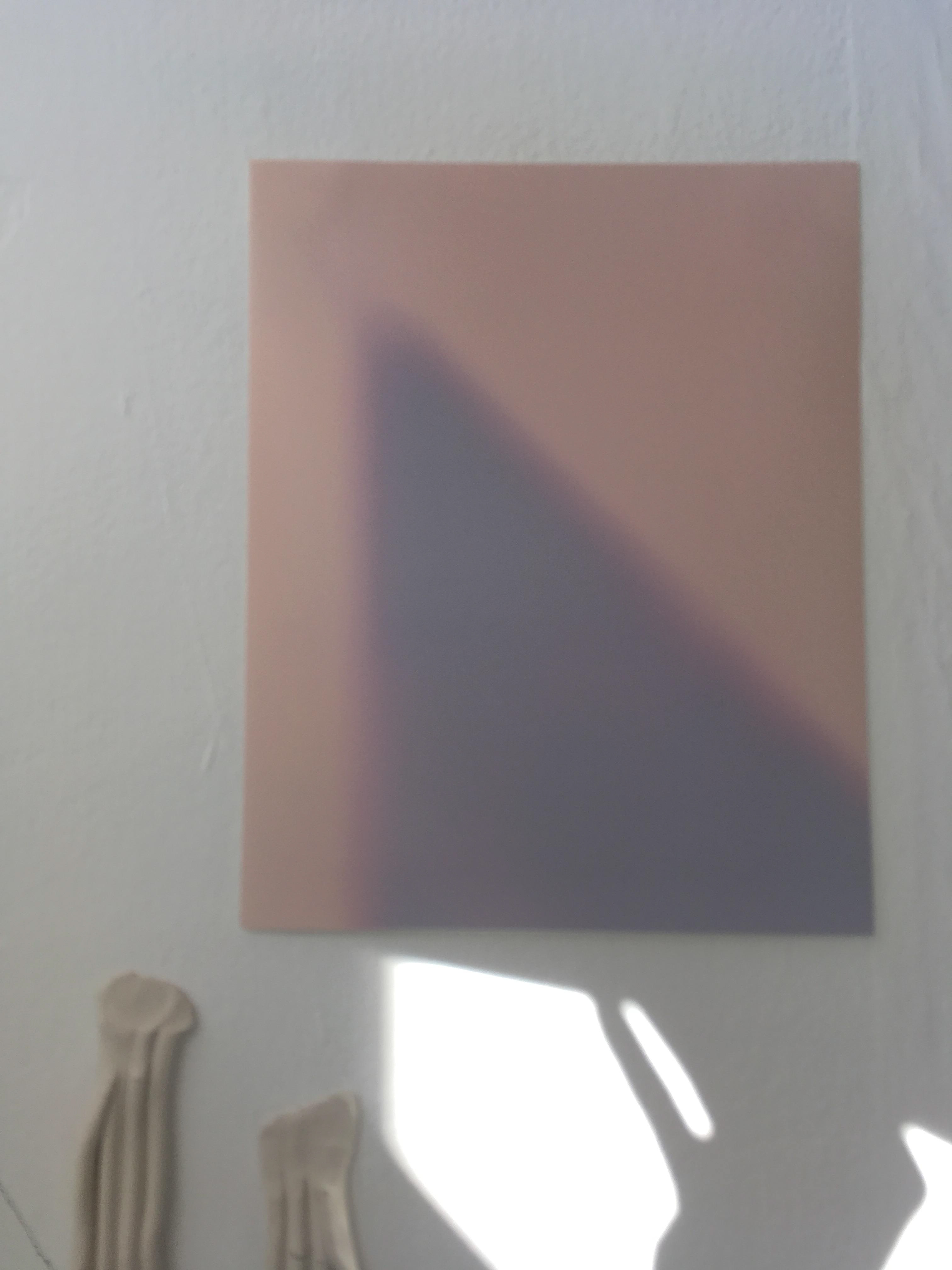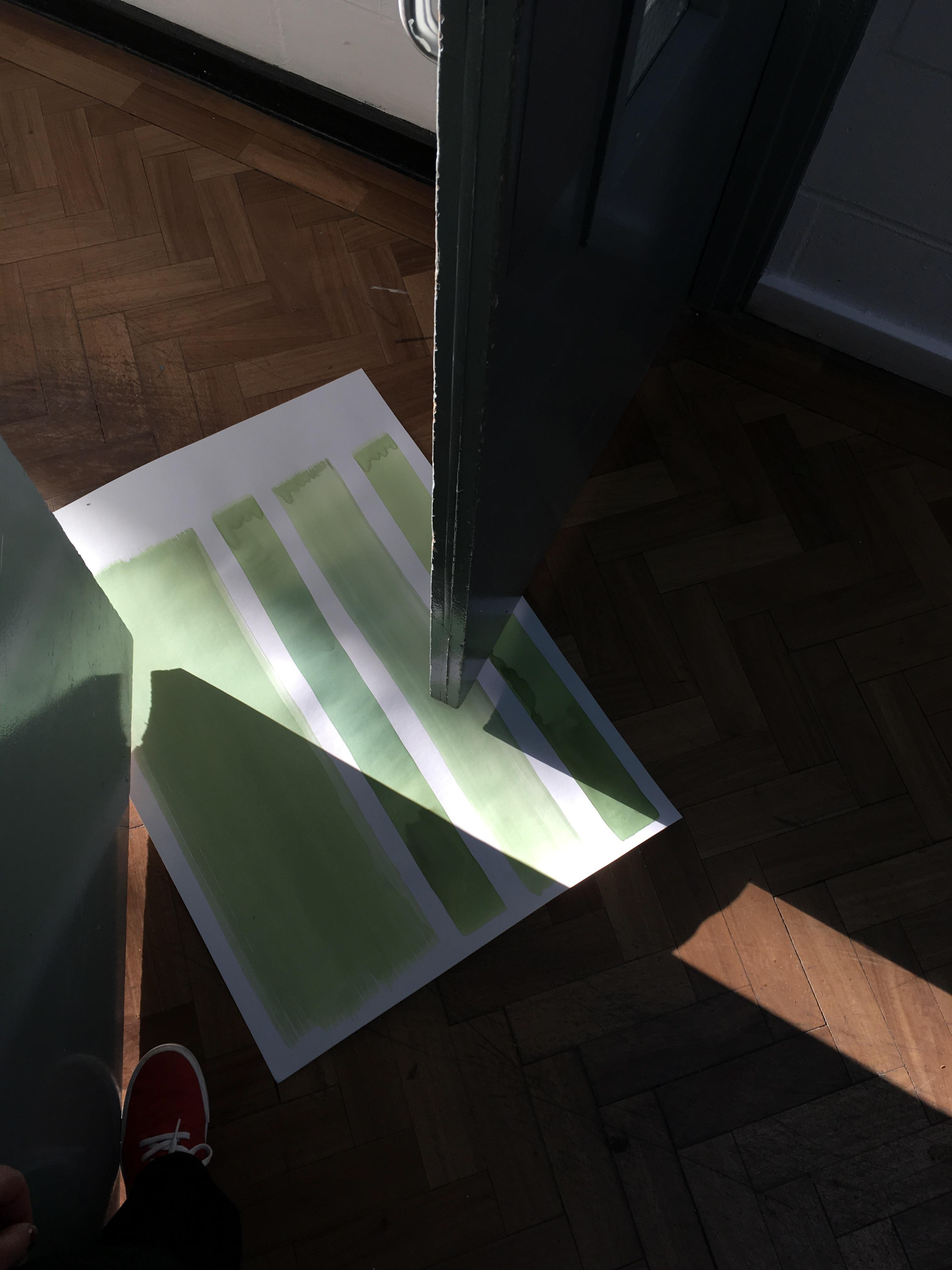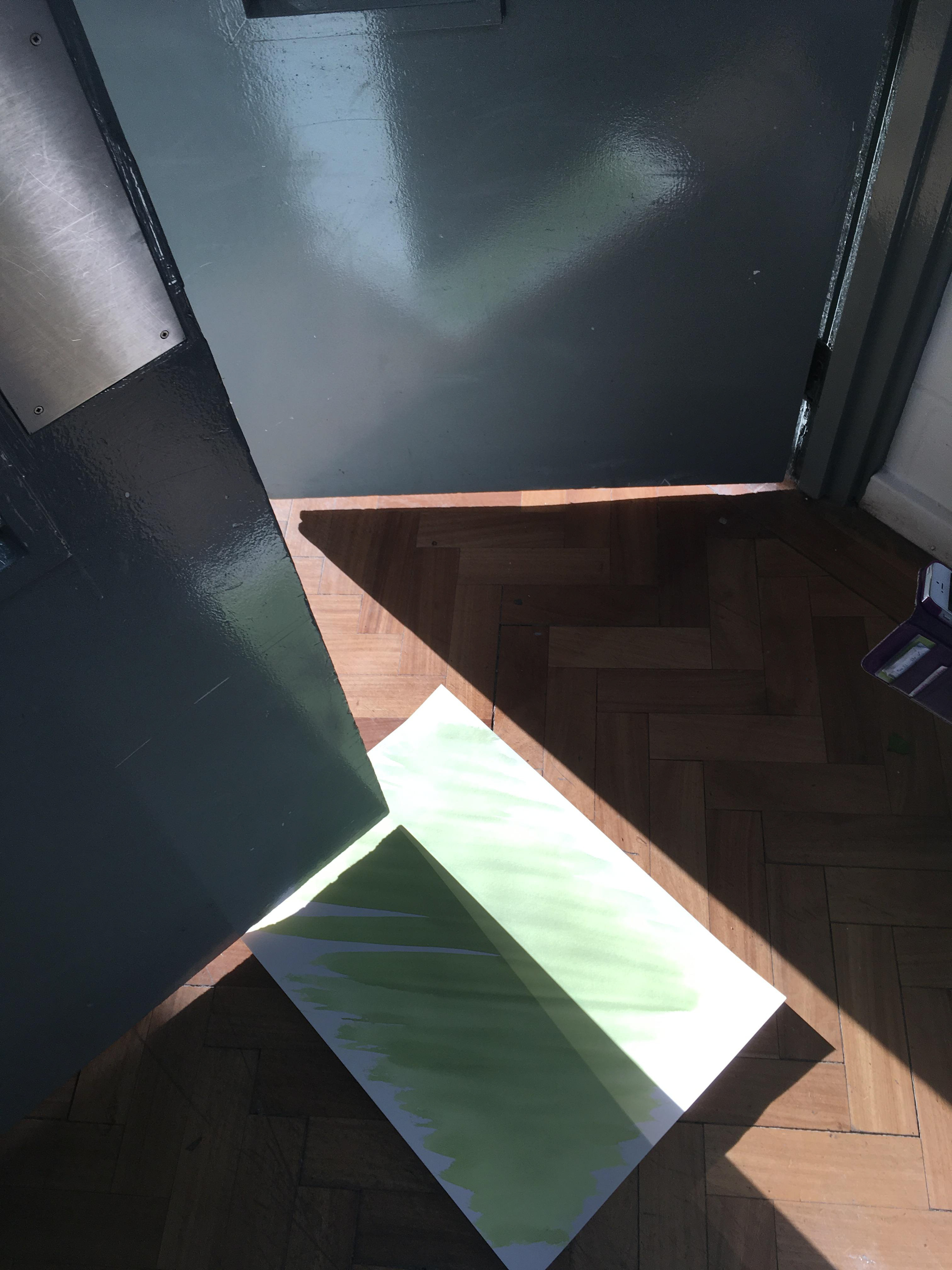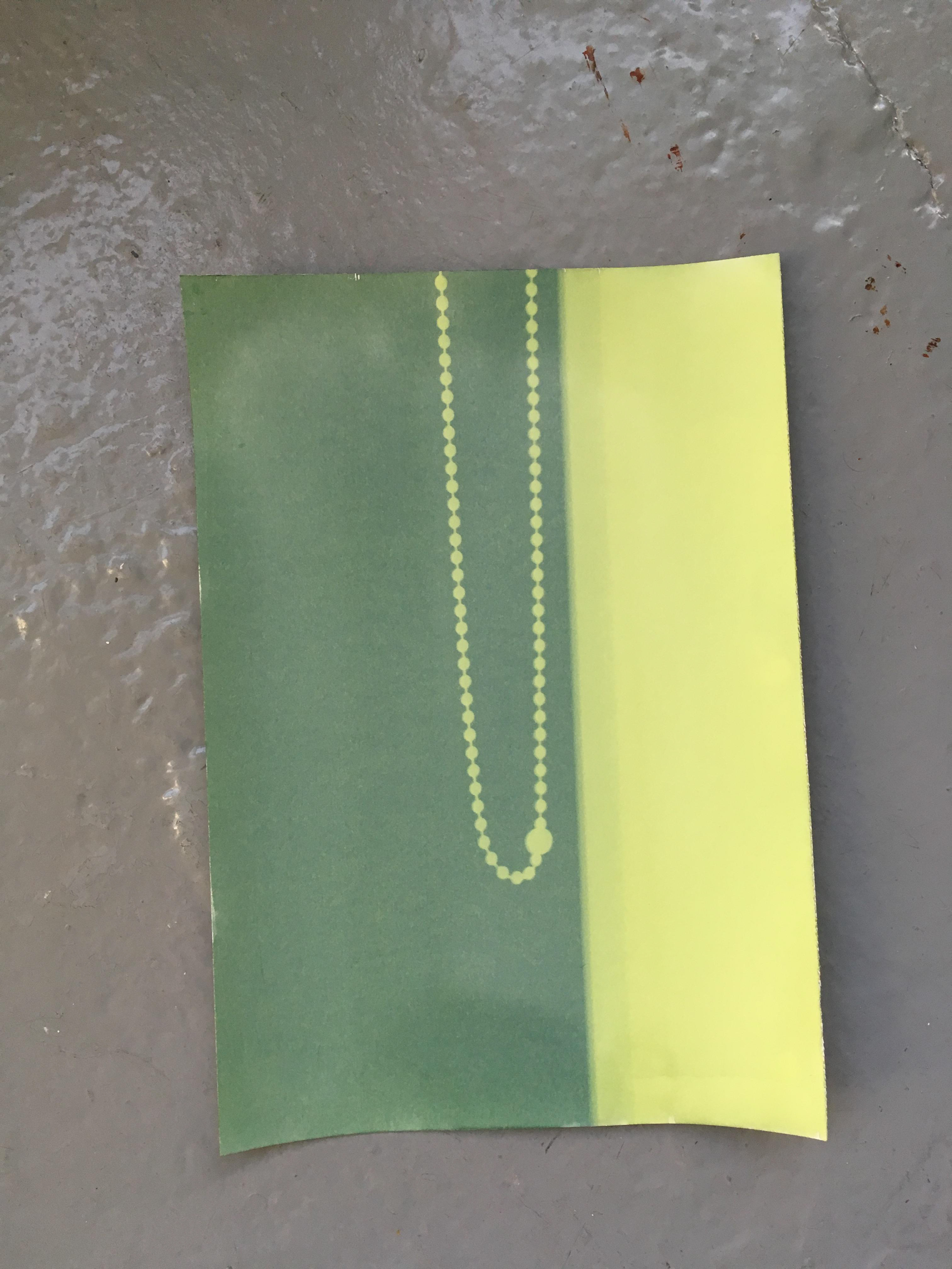The idea of recording the light movement has been an interest through my research in recording the studio and space. Peter Hofer was saying about the colours of the raw cyanotype being quite curious to look at, the lime green against the dark green, seems sci-fi. Interested in the idea of the work never being the same when looking at it, as the more time exposed the image will develop or blur out of the shape it was capturing once moved from location or the light source has disappeared.