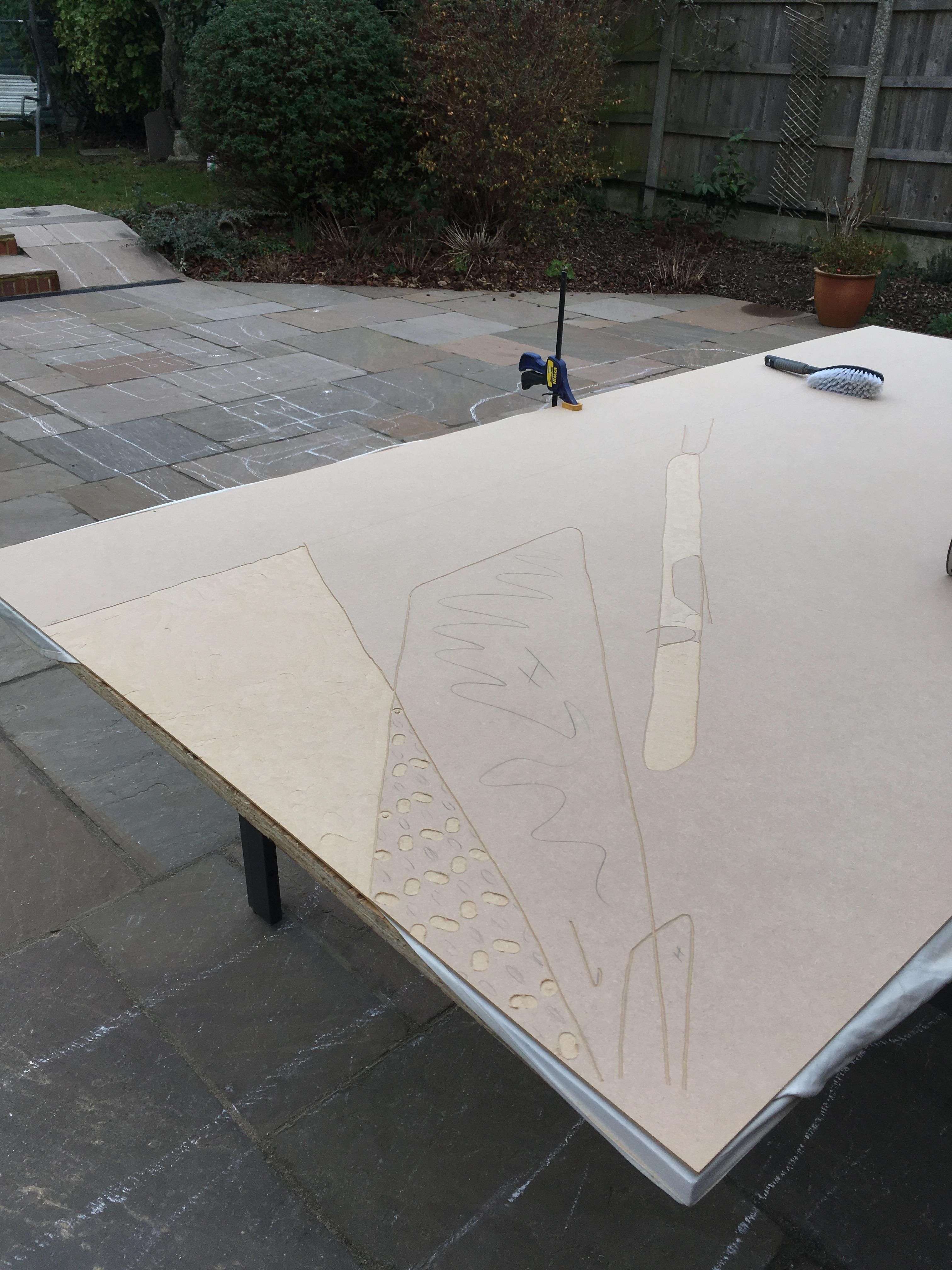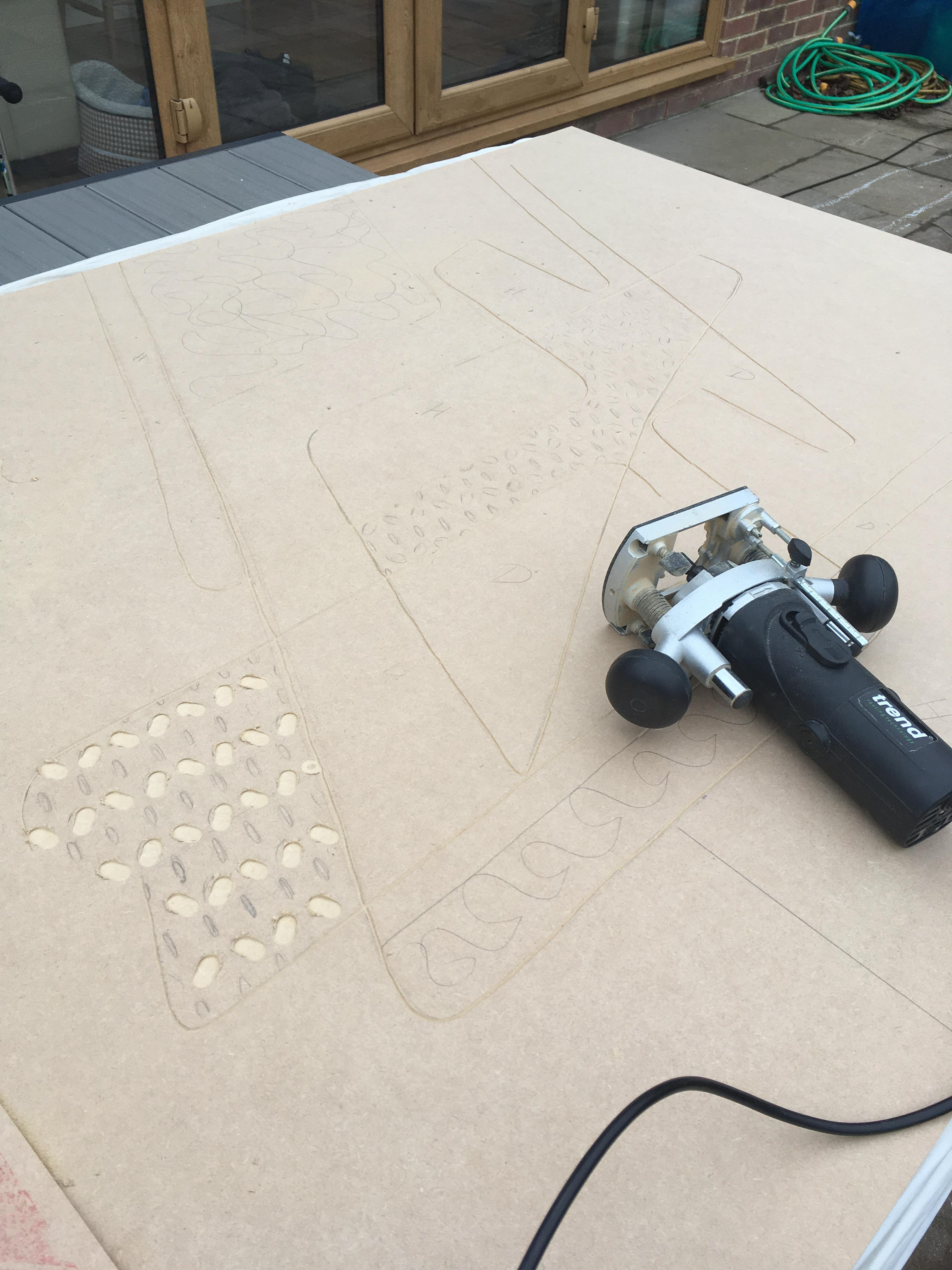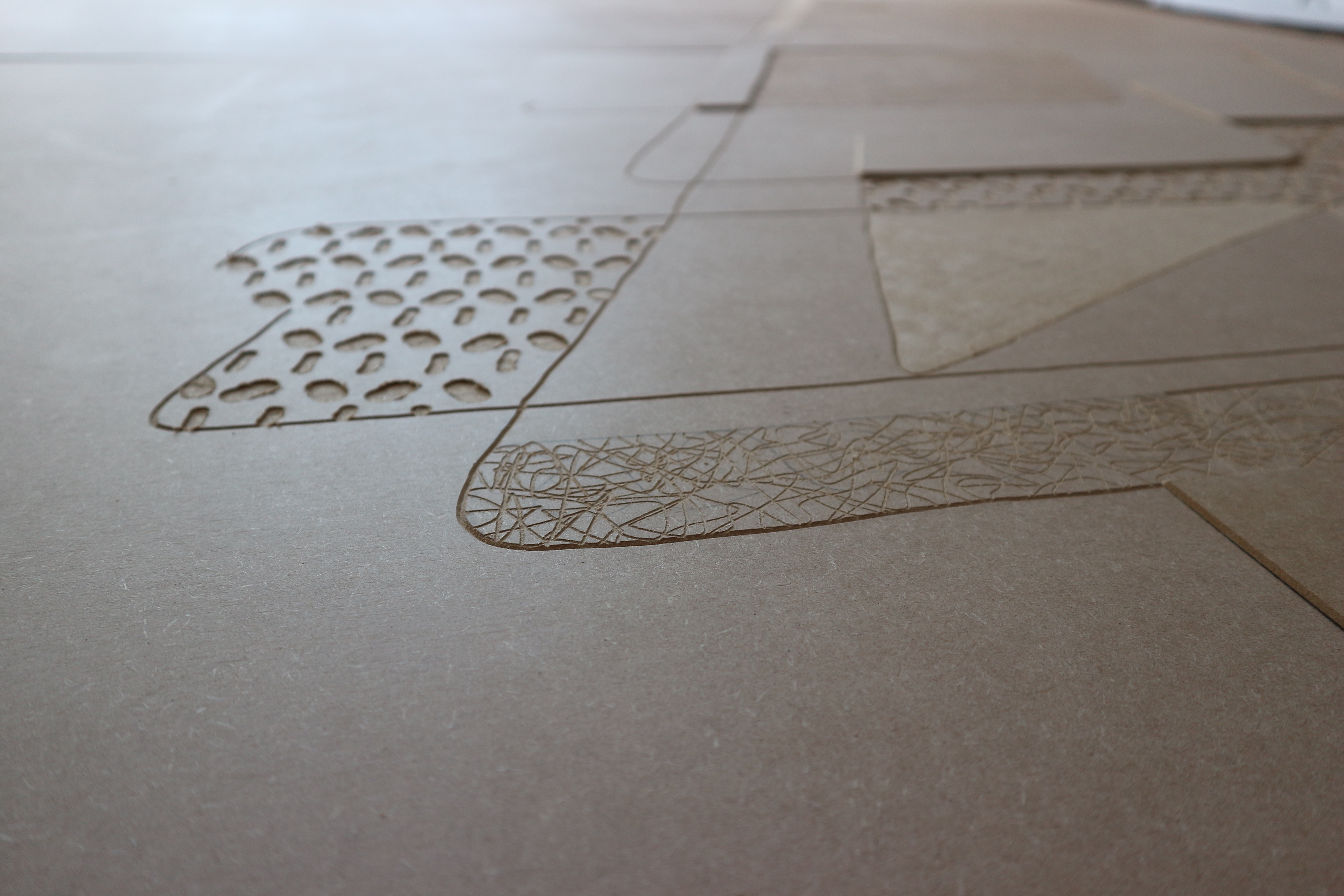 This idea of using the BOUNDARIES played into my wall layout, treating each 8x4 as an individual, when the the overlapping shapes crossed onto another board, I highlighted the difference by adding texture, height or carving away a layer. This goes back to the comment about being dependent on the space and that I let my work develop and take on influence from the situations that have occurred in my research.