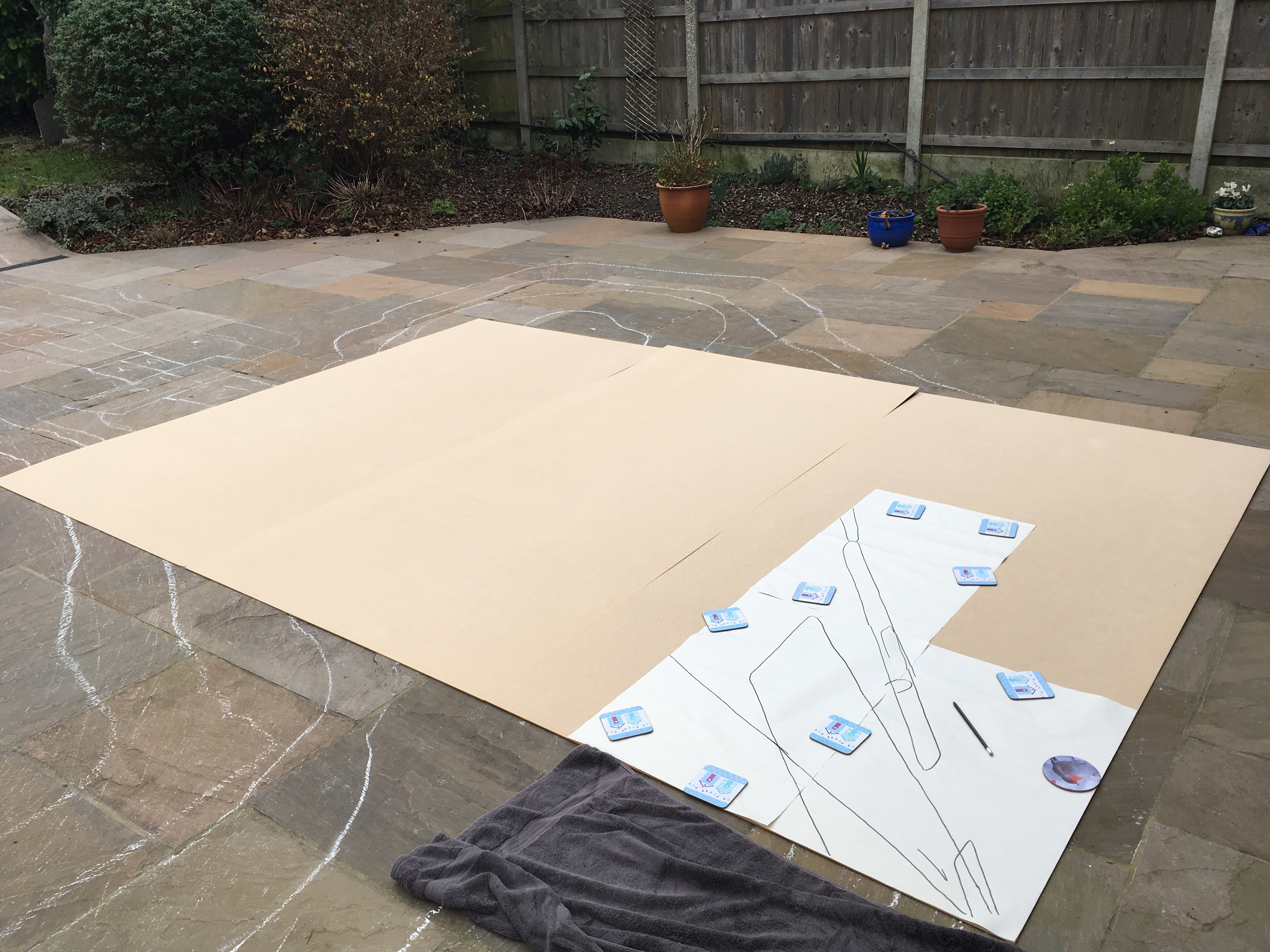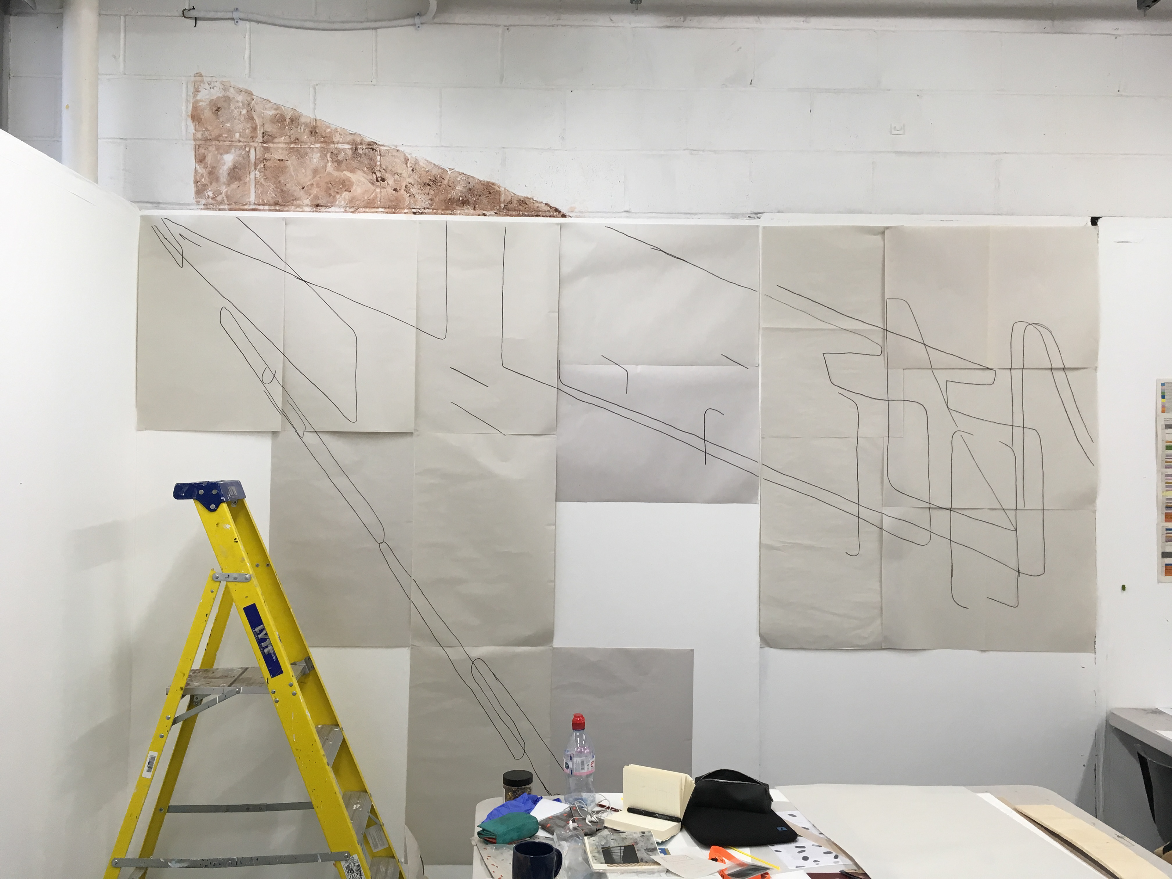 Creating my own walls- can add and remove layers from the walls more easily. Getting the exact same shape - 8x4 walls. From recording the the outlines onto newsprint paper an unexpected creation of a work appeared - I really liked the layout of the paper on the wall - creating this geometric pattern on the wall - adding to the feel of the piece - thinking about layers - positive and negative space.